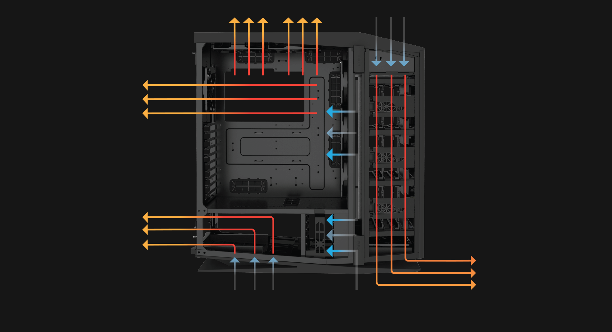 Conventional PCs use a single compartment with front mounted fans and vents as the main air intake, meaning fans spin faster to push air past hard drives, increasing fan noise and creating uneven cooling. Departing from the conventional, our new interior layout passes air directly through the Central Air Intake to the motherboard, CPU, graphics cards, and your power supply, providing superior airflow and maximum cooling.